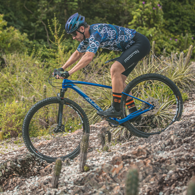 Uma gigante no quesito velocidade, a Auge possui Deore de 12 velocidades. Com pneus Continental Race king 29x2.2 e suspensão a ar, a bike apresenta um desempenho de agressividade nos obstáculos, sem perder a precisão nos movimentos.