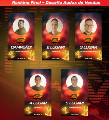 Ao longo do desafio, os participantes demonstraram comprometimento diário, criatividade nas ações comerciais e muita presença em campo, refletindo diretamente nos números alcançados e no fortalecimento da marca Audax. Com o encerramento da campanha, chegou o momento de conhecer os cinco representantes que mais se destacaram, conquistando as primeiras posições no ranking final.