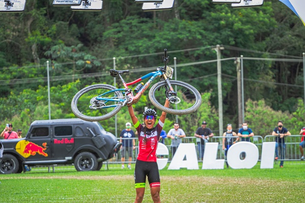 Emocionada, Olímpio ergue sua bike após brilhante vitória no Brasileiro de XCO. Foto: Reprodução.